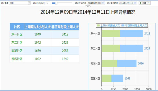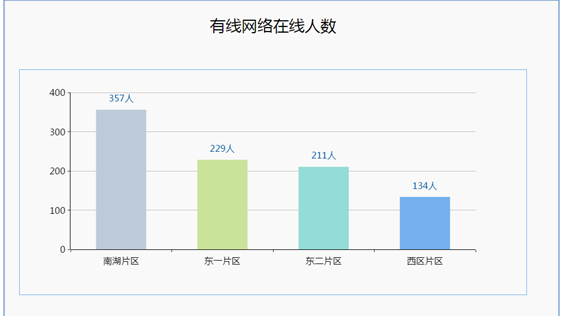 該部分只有柱狀圖展現(xiàn)在線人數(shù),柱子滿足維度下鉆至樓棟。該部分數(shù)據(jù)直接來自中間視圖表,數(shù)據(jù)每隔一分鐘更新一次,用計劃任調(diào)用后臺etl過程更新數(shù)據(jù)。報表也每隔一分鐘重新自動計算一次。從而達到網(wǎng)絡(luò)在線實時情況展現(xiàn)這一目標。