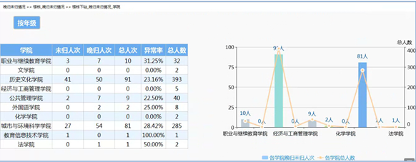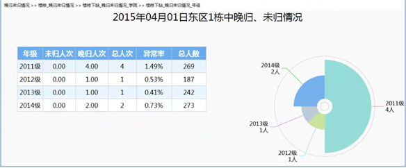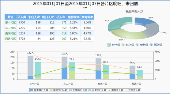 通過時間參數(shù)段內(nèi)的未歸人次、晚歸人次、男女異常率指標展示。