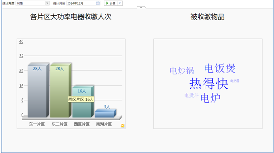 該部分內(nèi)容主要以圖形顯示,是柱狀圖和詞云圖的結(jié)合體。鉆取到最細力度是學生未歸電器收繳明細列表,包括學生的基本信息以及收繳的電器和收繳時間。