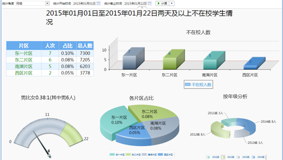 系統(tǒng)提供學生安全監(jiān)測與預(yù)警,利用學生的日常管理數(shù)據(jù),通過對信息的分析和比對,使學校能隨時掌握學生信息,及時發(fā)現(xiàn)安全隱患,保障學生安全。