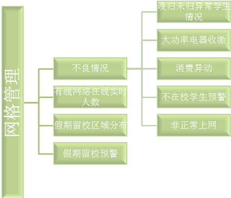 網(wǎng)格部分旨在進行網(wǎng)格化數(shù)據(jù)分析與展現(xiàn),涉及內(nèi)容包括宿舍管理,學生學業(yè)、生活、消費健康安全等各項內(nèi)容。何謂網(wǎng)格化管理,即仿效社區(qū)的網(wǎng)格化管理,按照一定的規(guī)則劃分成網(wǎng)格單元,每個網(wǎng)格單元分別管理。目標更加明確,管理更加細致。