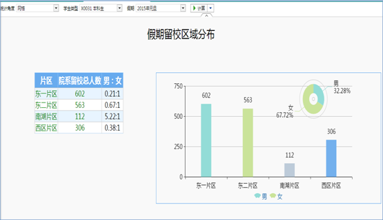 留校區(qū)域使用混合圖,柱子展現(xiàn)人數(shù)、餅圖展現(xiàn)男女比例,支持維度下鉆以及人數(shù)下鉆至明細列表。預(yù)警部分類似不在校預(yù)警,僅列入假期信息。