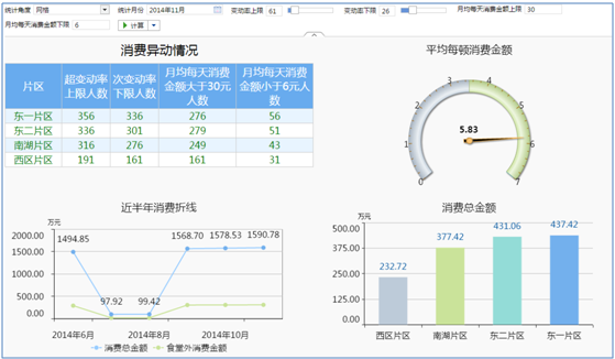 通過學生在食堂刷卡消費的明細數(shù)據(jù)進行整體分析,統(tǒng)計異動人次,再則鉆取到其消費明細。參數(shù)多樣,可滿足不同要求標準的數(shù)據(jù)展現(xiàn)。