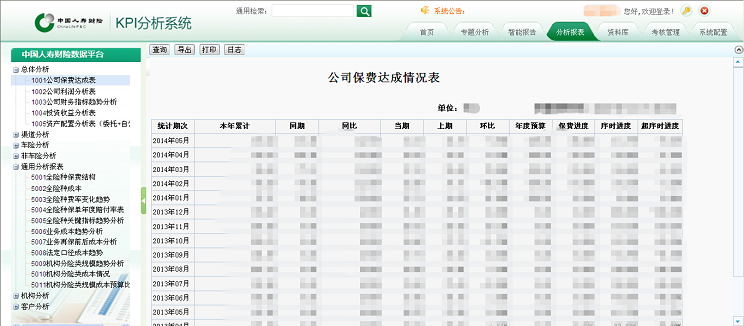 提供總體分析,渠道分析,車險(xiǎn)分析,非車險(xiǎn)分析,通用分析,機(jī)構(gòu)分析,客戶分析等數(shù)據(jù)分析服務(wù)。對(duì)保費(fèi)、利潤(rùn)、成本、預(yù)算、收益等指標(biāo)進(jìn)行匯總統(tǒng)計(jì)。通過BI數(shù)據(jù)服務(wù)平臺(tái)完成以上統(tǒng)計(jì)分析報(bào)表的設(shè)計(jì)與制作,并將這些報(bào)表集成到中國(guó)人壽財(cái)險(xiǎn)的業(yè)務(wù)平臺(tái),在中國(guó)人壽財(cái)險(xiǎn)業(yè)務(wù)平臺(tái)統(tǒng)一展現(xiàn)。