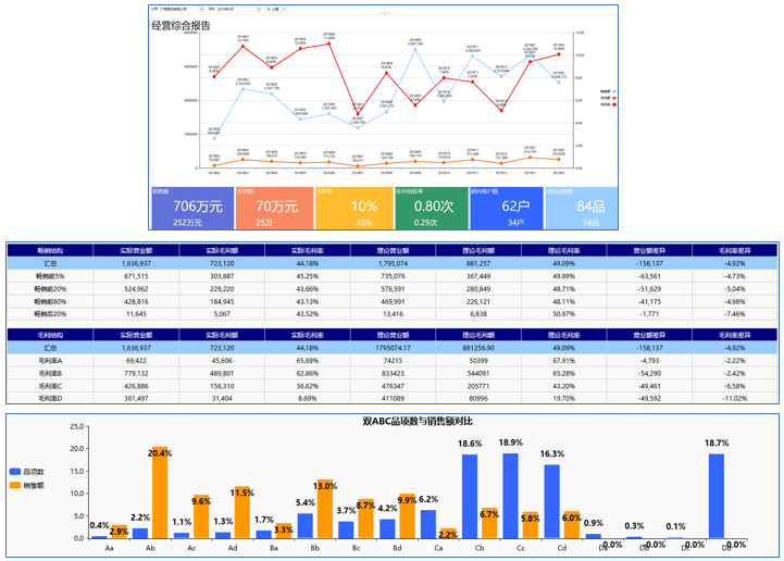 2、商品結構管理:各零售藥店每月商品銷售情況,包括品單價、品項占比、銷售占比、價格帶、雙ABC、品類效益、理論與實際、關聯(lián)率、微定價等等。