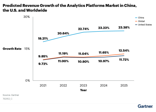 報(bào)告指出:中國(guó)分析平臺(tái)市場(chǎng)規(guī)模將持續(xù)增長(zhǎng)。在數(shù)字化轉(zhuǎn)型趨勢(shì)、自助服務(wù)、增強(qiáng)分析以及商業(yè)智能解決方案的推動(dòng)下,到2023年,整體分析采用率將從35%增加到50%。預(yù)計(jì)到2025年,中國(guó)分析平臺(tái)市場(chǎng)規(guī)模將達(dá)到16億美元,市場(chǎng)增長(zhǎng)率將由18.21%提升到23.38%,是全球(12.54%)和美國(guó)(11.72%)市場(chǎng)預(yù)期增長(zhǎng)的兩倍左右。