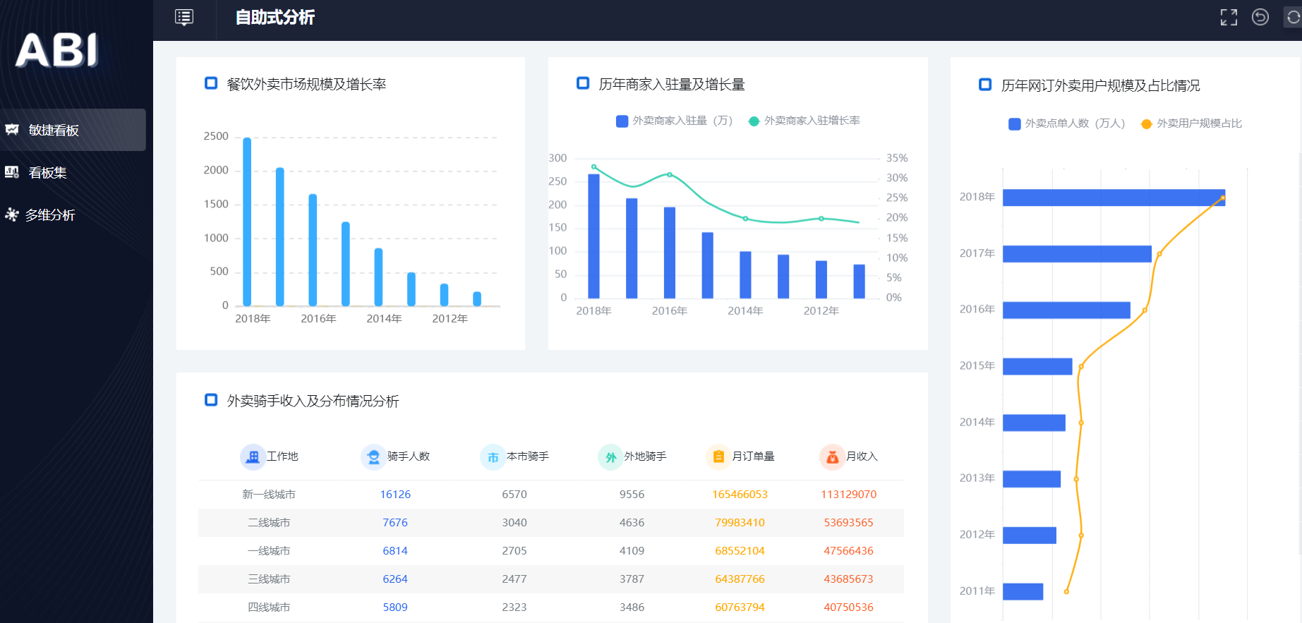 在互聯(lián)網(wǎng)、大數(shù)據(jù)等信息技術(shù)迅猛發(fā)展的當下,我們迎來了大數(shù)據(jù)時代。與此同時,數(shù)字經(jīng)濟的快速發(fā)展不斷催生新產(chǎn)業(yè)新業(yè)態(tài)新模式,正成為經(jīng)濟社會發(fā)展的新動能。數(shù)據(jù)已經(jīng)成為繼土地、勞動力、資本、技術(shù)之后的第五大生產(chǎn)要素,大數(shù)據(jù)這個詞在互聯(lián)網(wǎng)時代也變得越來越熱門。 2016年中國網(wǎng)約車大戰(zhàn)滴滴和優(yōu)步開始爭奪中國網(wǎng)約車市場。這一大戰(zhàn)從2014年到2016年末持續(xù)了近兩年,滴滴和優(yōu)步分別開啟補貼搶人,一再的降價、補貼和發(fā)券留住用戶,僅2015年兩者就虧損超過200億。最終,滴滴宣布收購Uber,至此,滴滴在網(wǎng)約車領(lǐng)域一家獨大。 為什么滴滴和優(yōu)步背后的資本虧損如此之大都還要堅持這場網(wǎng)約車大戰(zhàn)?答案只有一個,就是數(shù)據(jù)。滴滴能夠為資本提供的數(shù)據(jù)是海量而且細致的,能夠產(chǎn)生的價值是無法估量的,所以雙方都要爭奪這個市場。 那么大數(shù)據(jù)到底是什么呢?大數(shù)據(jù)有什么用,大數(shù)據(jù)有什么價值?接下來小億和大家一起來看看。 一、什么是大數(shù)據(jù)? 大數(shù)據(jù)和數(shù)據(jù)之間就差一個“大”字,那么大數(shù)據(jù)就是大量的數(shù)據(jù)嗎?其實并不是。 目前關(guān)于大數(shù)據(jù)的概念眾說紛紜,到目前為止,還沒有一個明確的統(tǒng)一的定義,不同組織機構(gòu)對大數(shù)據(jù)有著不同的描述。麥肯錫認為,大數(shù)據(jù)是指大小超出了典型數(shù)據(jù)庫軟件的采集存儲管理和分析等能力的數(shù)據(jù)集。而維基百科給出的定義是,無法在一定時間內(nèi)使用常規(guī)的軟件工具,對其內(nèi)容進行抓取管理和處理的大量而復雜的數(shù)據(jù)集合。 但不論哪一種描述,關(guān)于大數(shù)據(jù)的特征卻是一致公認的。在早期就提出了一個縮寫詞來描述大數(shù)據(jù)特征,即“VVVV”。首先第一個V指的是Volume,容量。主要指非結(jié)構(gòu)化數(shù)據(jù)的規(guī)模和增長速度。因為非結(jié)構(gòu)化數(shù)據(jù)占數(shù)據(jù)總量的80%到90%,同時也比結(jié)構(gòu)化數(shù)據(jù)增長快十倍到50倍,并且數(shù)據(jù)量是傳統(tǒng)數(shù)據(jù)庫的十倍到50倍。第二個V指的是為Variety,多元化。主要指大數(shù)據(jù)的易構(gòu)和多樣性。數(shù)據(jù)有很多不同的形式,比如文本圖像視頻機器數(shù)據(jù)等等,這些數(shù)據(jù)大多是無模式或者是模式不明顯。第三個V值得是value,價值,主要體現(xiàn)在大量的不相關(guān),信息價值密度低,需要通過深度復雜分析,才可以對未來的趨勢和模式進行預(yù)測。第四個V指的是Velocity高效。主要體現(xiàn)在實時分析,實時呈現(xiàn)分析結(jié)果。 二、大數(shù)據(jù)有什么用? 當人們談?wù)摯髷?shù)據(jù)時,他們在談什么? 大數(shù)據(jù)的火熱應(yīng)用滲透進了各行各業(yè),但很少有人能夠真正認識到大數(shù)據(jù)的核心意義所在,可以說在現(xiàn)在的時代,數(shù)據(jù)驅(qū)動發(fā)展一點也不為過,那我們一起來看看大數(shù)據(jù)究竟有什么用? 1、大數(shù)據(jù)的處理分析將成為信息技術(shù)融合發(fā)展的新節(jié)點。 移動互聯(lián)網(wǎng)、物聯(lián)網(wǎng)、社交網(wǎng)絡(luò)、數(shù)字家庭、電子商務(wù)等是新一代信息技術(shù)的應(yīng)用形態(tài),這些應(yīng)用不斷產(chǎn)生大數(shù)據(jù)。云計算為這些海量、多樣化的大數(shù)據(jù)提供存儲和運算平臺。通過對不同來源數(shù)據(jù)的管理、處理、分析與優(yōu)化,將結(jié)果反饋到上述應(yīng)用中,將創(chuàng)造出巨大的經(jīng)濟和社會價值。大數(shù)據(jù)具有催生社會變革的能量。但釋放這種能量,需要嚴謹?shù)臄?shù)據(jù)治理、富有洞見的數(shù)據(jù)分析和激發(fā)管理創(chuàng)新的環(huán)境。 有了數(shù)據(jù)還要對數(shù)據(jù)進行分析,恰好億信華辰研發(fā)的BI工具億信ABI就能很好的做到這一點。億信ABI打通了從數(shù)據(jù)接入、到數(shù)據(jù)建模與處理、再到數(shù)據(jù)分析與挖掘整個數(shù)據(jù)應(yīng)用全鏈路,可滿足企業(yè)經(jīng)營中各類復雜的分析需求,幫助企業(yè)實現(xiàn)高效數(shù)字化轉(zhuǎn)型。 2、大數(shù)據(jù)是信息產(chǎn)業(yè)持續(xù)高速增長的新引擎。 面向大數(shù)據(jù)市場的新技術(shù)、新產(chǎn)品、新服務(wù)、新業(yè)態(tài)會不斷涌現(xiàn)。在硬件與集成設(shè)備領(lǐng)域,大數(shù)據(jù)將對芯片、存儲產(chǎn)業(yè)產(chǎn)生重要影響,還將催生一體化數(shù)據(jù)存儲處理服務(wù)器、內(nèi)存計算等市場。在軟件與服務(wù)領(lǐng)域,大數(shù)據(jù)將引發(fā)數(shù)據(jù)快速處理分析、數(shù)據(jù)挖掘技術(shù)和軟件產(chǎn)品的發(fā)展。 3、大數(shù)據(jù)利用將成為提高核心競爭力的關(guān)鍵因素。 各行各業(yè)的決策正在從“業(yè)務(wù)驅(qū)動”轉(zhuǎn)變“數(shù)據(jù)驅(qū)動”。對大數(shù)據(jù)的分析可以使零售商實時掌握市場動態(tài)并迅速做出應(yīng)對;可以為商家制定更加精準有效的營銷策略提供決策支持;可以幫助企業(yè)為消費者提供