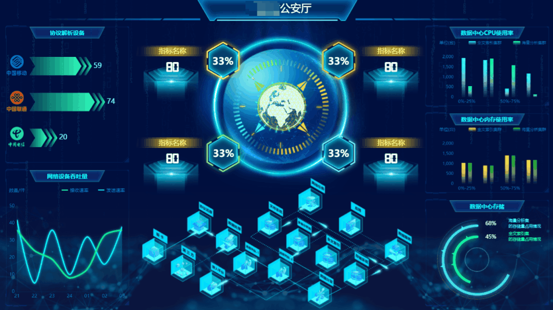 04 大屏可視化組件--輔助圖表 輔助圖表通常圍繞視覺(jué)中心的四周,起到錦上添花的作用,用來(lái)呈現(xiàn)次要指標(biāo),從各種維度進(jìn)一步細(xì)化核心指標(biāo)。 不需要設(shè)置任何數(shù)據(jù),實(shí)時(shí)顯示的當(dāng)下時(shí)間,并且以時(shí)鐘表盤的方式,古典有韻味。 05 大屏可視化組件--溫度計(jì)條形圖 條形圖是用寬度相同的條形的高度或長(zhǎng)短來(lái)表示數(shù)據(jù)多少的圖形。借用溫度計(jì)的形象,生動(dòng)展示數(shù)據(jù)占比的情況。 06 大屏可視化組件--3D網(wǎng)格線地球 有了這些組件,還怕做不出酷炫的大屏嗎??jī)|信ABI值得擁有。 我們只需要在酷屏設(shè)計(jì)器拖拽組件即可實(shí)現(xiàn),組件上的文本、數(shù)值全部支持界面化修改,方便我們快速轉(zhuǎn)化業(yè)務(wù)含義。