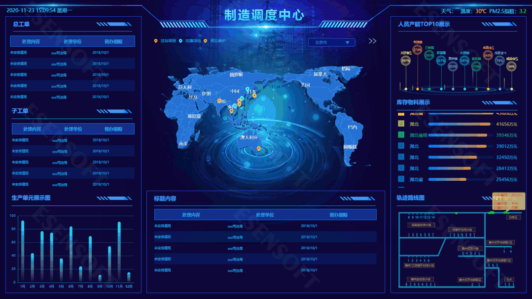 —TOP 4— 制度調度大屏 最佳分辨率:1920*1080 使用場景:工業(yè)4.0時代,制造業(yè)也開始積極響應產業(yè)數字化的號召,融合大數據分析、3D地圖等技術,構建體系先進、功能強大、場景豐富的制造調度指揮系統(tǒng),滿足了生產調度、應急指揮、遠程指揮、綜合決策以及企業(yè)宣傳等多種應用場合。 展現(xiàn)邏輯:通過世界地圖一覽在建及歷史項目的運轉狀態(tài),方便售后維護;另外對于制造中心內的總工單、子工單、物料消耗、人員產能等指標進行充分直觀地展現(xiàn)。