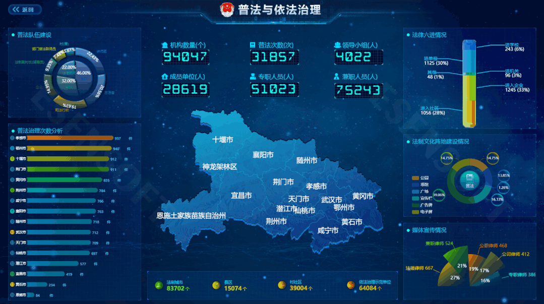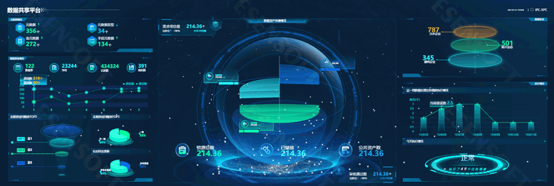 —TOP 2— 法制宣傳大屏 最佳分辨率:1920*1080 使用場景:了解普法工作的推進情況,包括隊伍建設、媒體宣傳、各個縣市的大數據對比等,對于有法制宣傳,法律服務等需求的行業(yè)提供大屏承載方案,助其成為暢通社情民意、服務保障民生的監(jiān)管新陣地。 展現(xiàn)邏輯:使用樣式各異的圖表,展示法律行業(yè)內的不同需求的數據,根據地理位置等信息數據,直觀、便捷的展現(xiàn)數據結果,讓人一目了然。 —TOP 3— 數據共享大屏 最佳分辨率:4800*1620 使用場景:將數據集中到數據共享平臺,實現(xiàn)多數據源管理,透明化的服務支持,使得數據資源可觀、可感、可控,智能化的提出數據共享側的建議。最終,加強決策和預測能力從而提升公司整體數據管理水平。 展現(xiàn)邏輯:實時展示數據資產申請情況、元數據情況、數據質檢情況、數據安全、執(zhí)行情況等信息,并添加大量的動畫效果使其充滿科幻感。