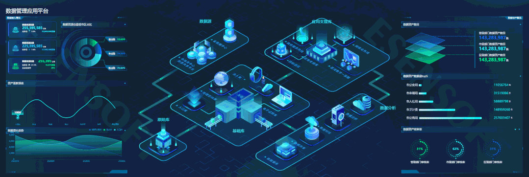 別急,稱得上是可視化領域的種子選手:億信ABI的大屏模塊——酷屏帶著一籮筐解決方法來了,該系統(tǒng)內置18套精美且免費的大屏模板,用戶可一鍵套用,助您快速高效地制作出酷炫大屏。 如果還“不滿足”,咱們酷屏市場還會定期更新時下最酷最IN的模板與組件,用戶可自行試用和購買。今天小億給大家分享酷屏市場中最受歡迎的5套模板,來看看這些“高顏值”模板的應用場景吧,文末有獲取鏈接哦! —TOP 1— 數據管理應用大屏 最佳分辨率:4800*1620 使用場景:精準對接政企的數據治理的可視化需求,利用動態(tài)的圖表將數據的流轉狀態(tài)清晰展示,明確數據治理的路徑和流程。另外,各個部門的數據資產使用狀況和資源利用率得以清晰地展現(xiàn),對于管理者來說可以及時并針對性的提出解決方案。 展現(xiàn)邏輯:中心以動畫效果展示數據管理應用的整個流程,實時展示數據接入情況、數據增長趨勢、數據資產概況等信息。