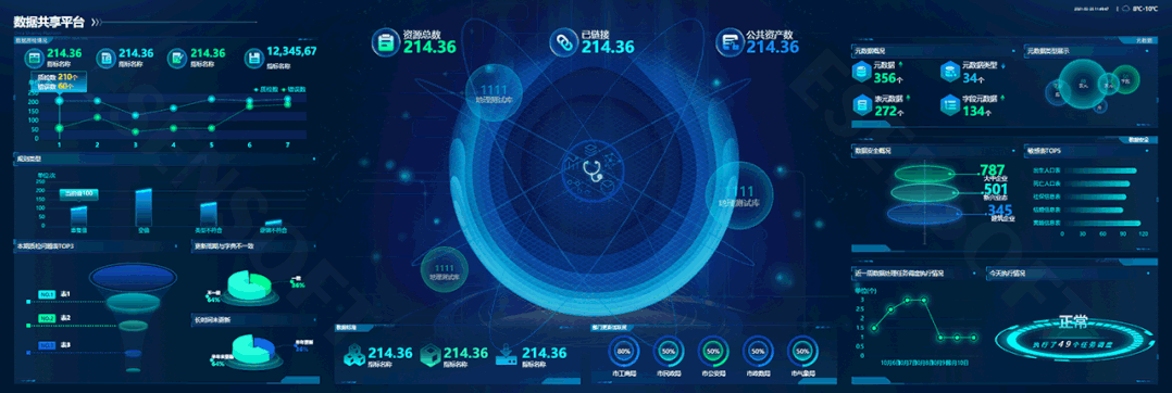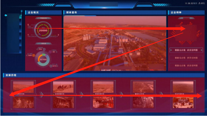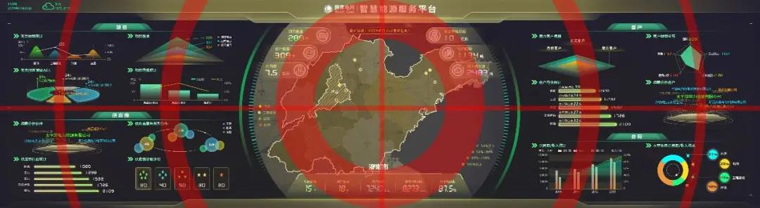 再者,設(shè)計(jì)人員需要明確大屏的視覺路線即展示路線,這條線能講出怎樣的故事跟你的布局構(gòu)圖密切相關(guān)。下面提供幾種常見的構(gòu)圖思路,希望對(duì)大家有所啟發(fā)和幫助。 1、中心放射型 以中間核心內(nèi)容向周圍放射,正中多以地圖和給人視覺沖擊的主視覺為主,起到聚焦凸顯的作用,層次明晰,主次分明。 2、故事線型 該類型主要是依靠建設(shè)一條完整的視覺導(dǎo)線,引導(dǎo)觀看者從一端往另一端吸收信息,該構(gòu)圖簡(jiǎn)單易懂,比較適合有嚴(yán)格順序的數(shù)據(jù)信息,例如企業(yè)的展示大屏等。 3、數(shù)據(jù)平鋪型 這是一種最為普遍的構(gòu)圖手法,一般是將同級(jí)別的數(shù)據(jù)信息一起展示出來,區(qū)塊清晰明確一目了然。但即使是平鋪,也是有輕有重,一般以板塊劃分的大小來界定分配。 配色篇亂花漸欲迷人眼