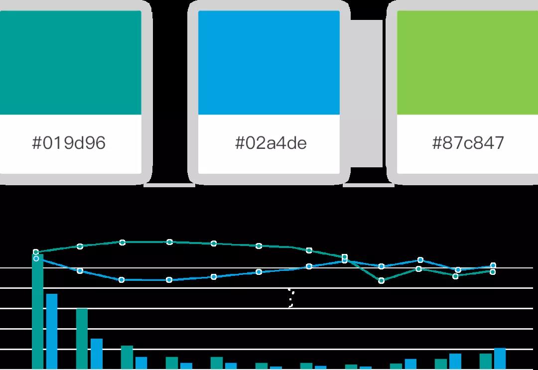 當(dāng)圖表需要的顏色較多時(shí),建議最多不超過12種色相。通常情況下人在不連續(xù)的區(qū)域內(nèi)可以分辨6~12種不同色相。過多的顏色對(duì)傳達(dá)數(shù)據(jù)是沒有作用的,反而會(huì)讓人產(chǎn)生迷惑。